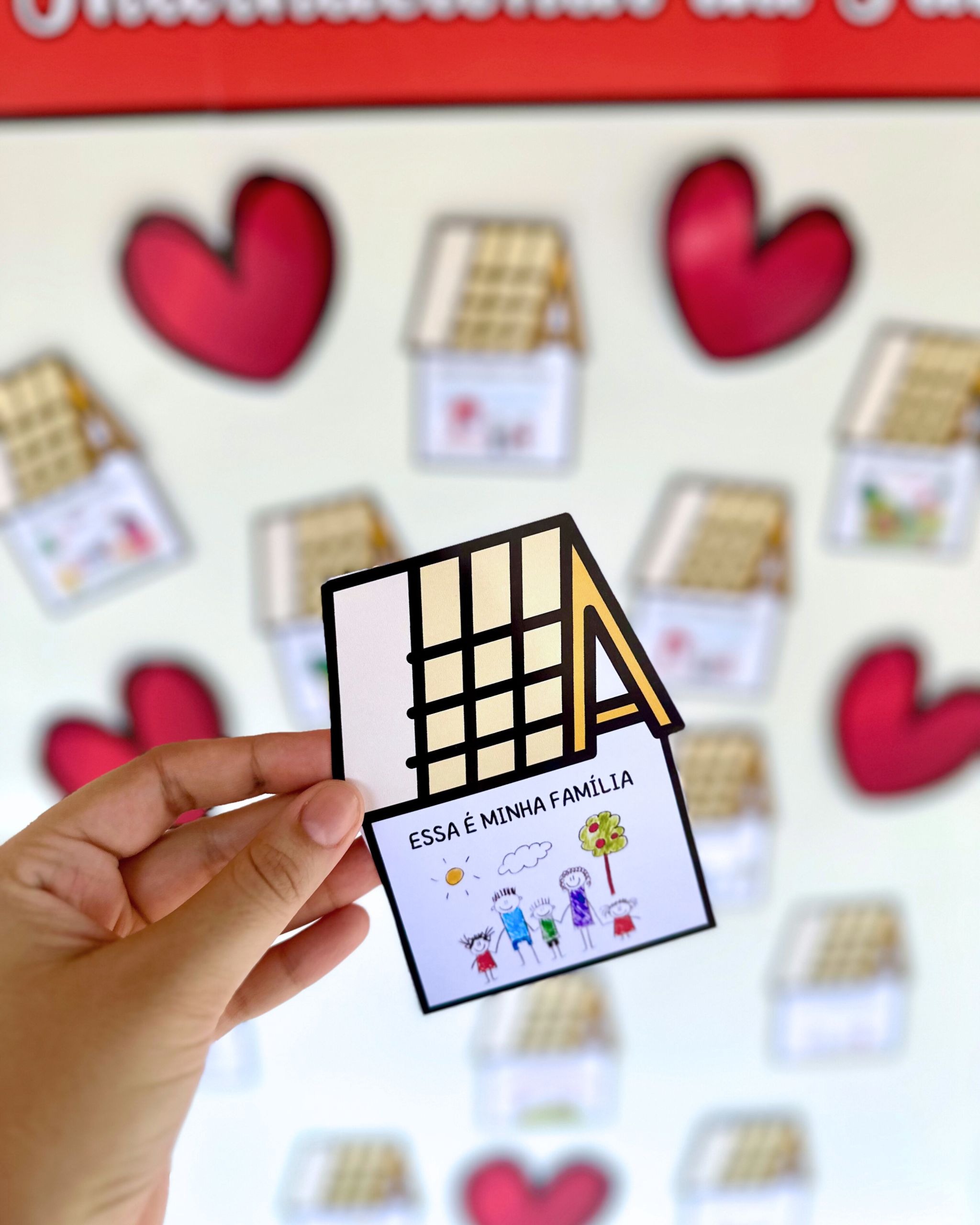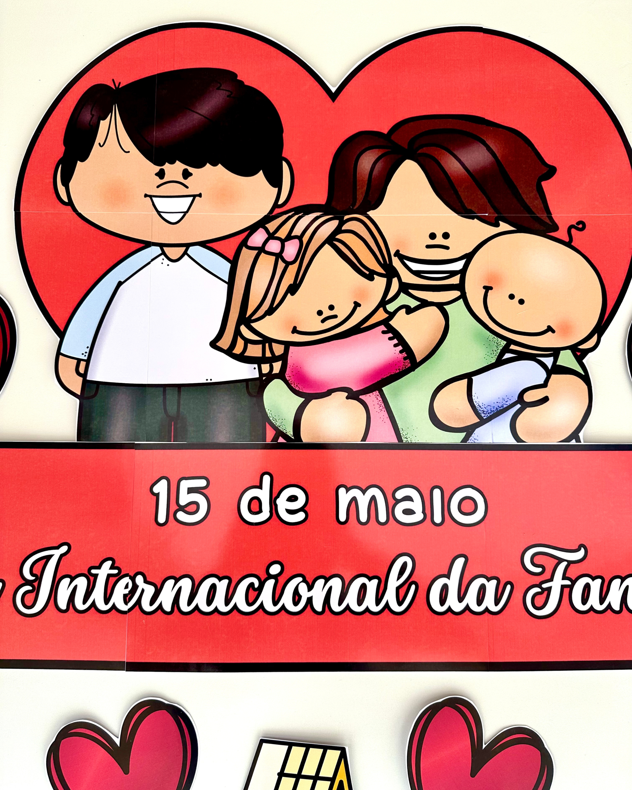 Arquivo para decoração de porta tema Dia Internacional da Família. o arquivo vai em PDF pronto para impressão e inclui as imagens já ampliadas e casinhas na opção colorida e para colorir, para a criança desenhar sua família.