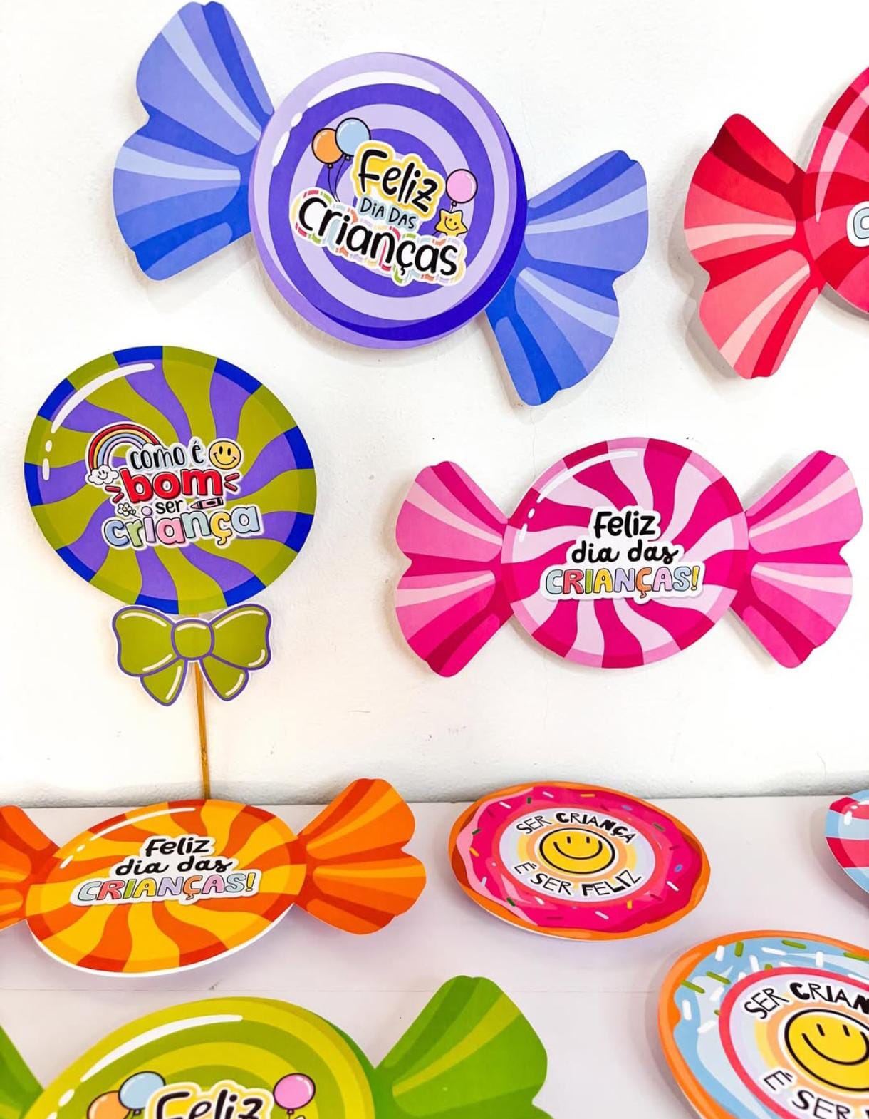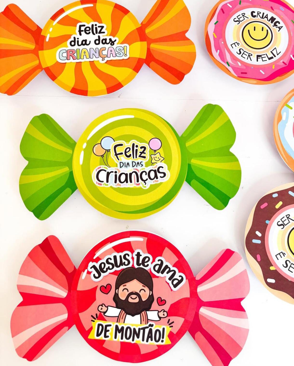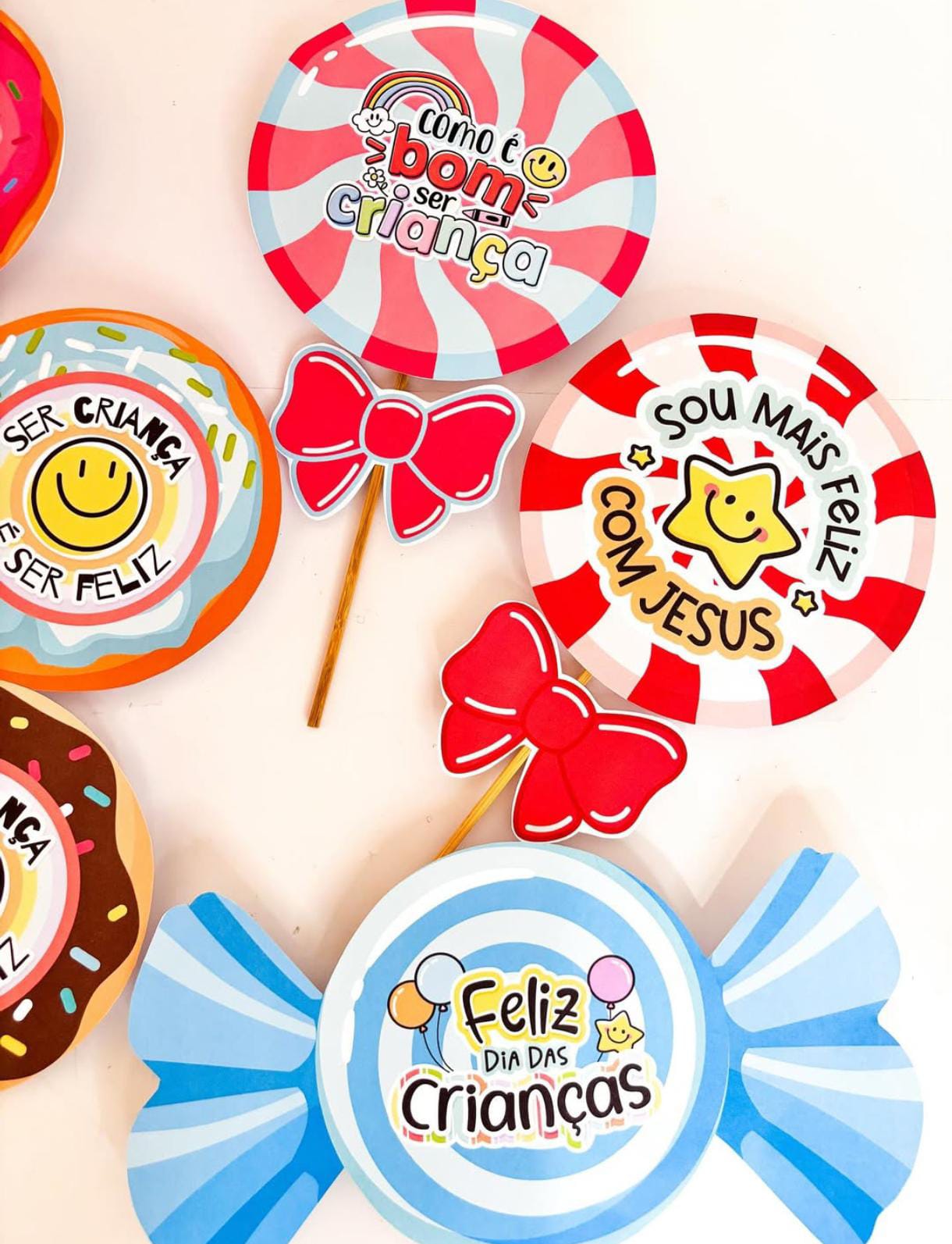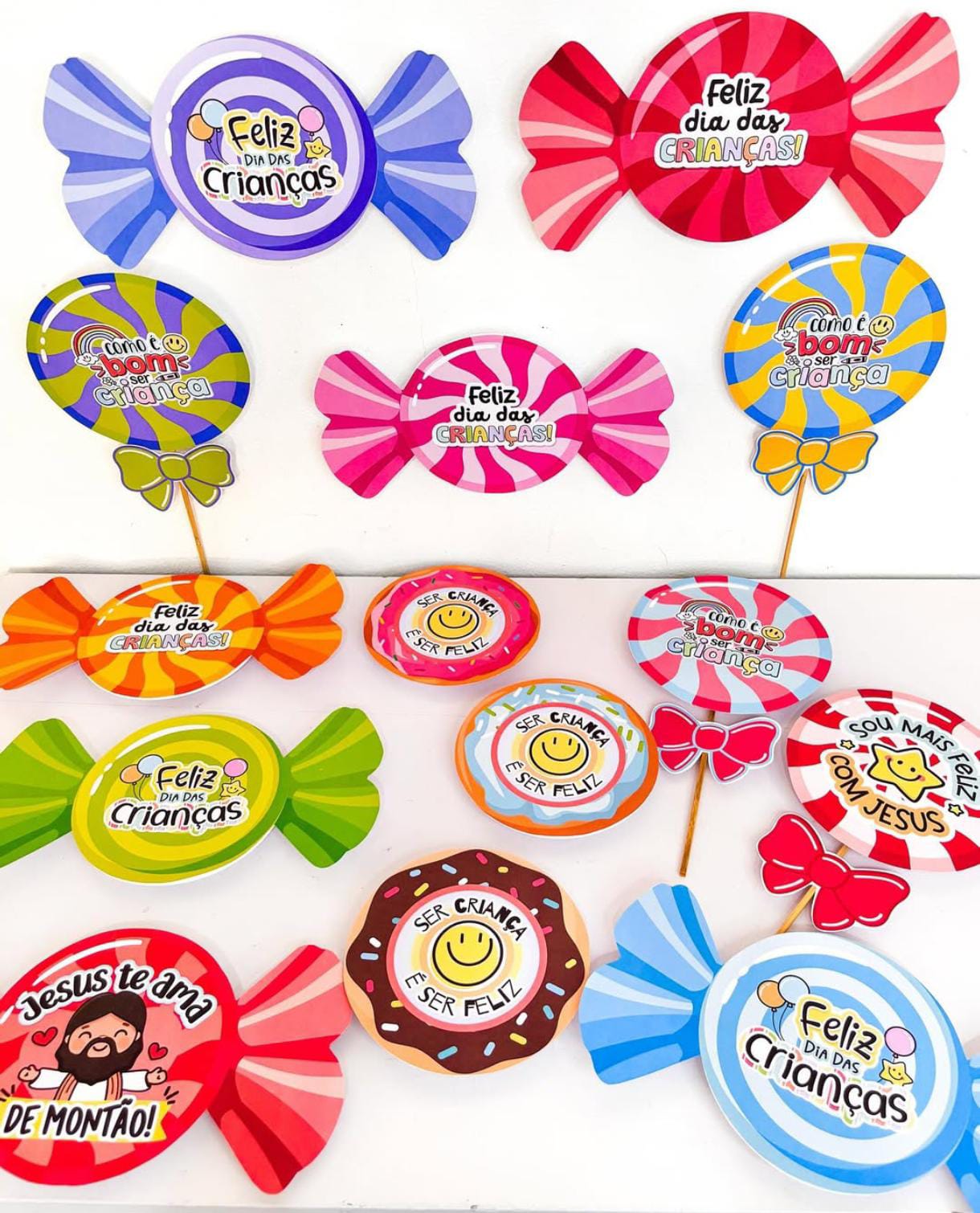Preparamos um material encantador com 3 versões criativas de porta guloseimas: 🍭 pirulito, 🍬 bala e 🍩 donuts, com 14 variações exclusivas! 😍